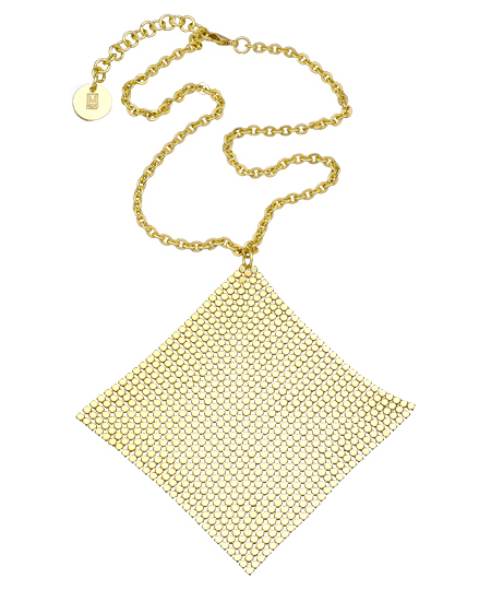 Show everyone just how much of a fashion plate you are in this gold fold specchio cone necklace from 1AR By UnoAerre. The pendant portion is made in a chain mail design will lays softly against the skin. This necklace fastens with a lobster claw closure.