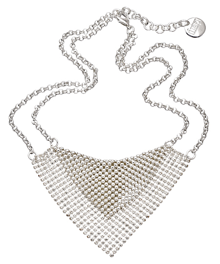 Arm yourself with incredible accessories like the fine silver plated specchio bib necklace from 1AR By UnoAerre. The center bib portion is a chain mail like material which is cut into the shape of a diamond. This necklace fastens with a lobster claw closure.