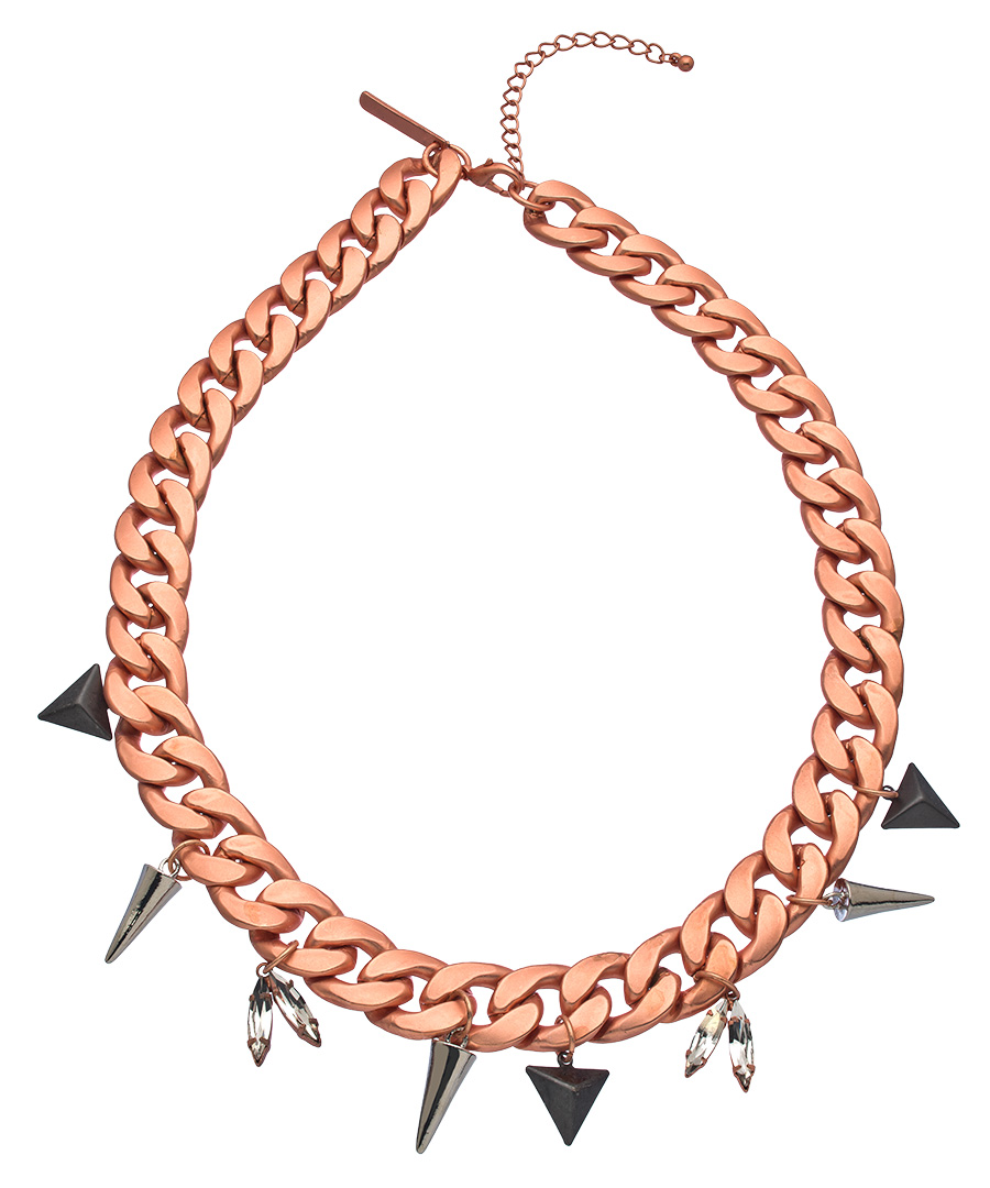 Delightful, feminine - but with a modern twist, this 8 Other Reasons rose gold, gunmetal, silver and crystal Combat spike necklace is the one to be seen in. Smooth rose gold curb chain is adorned with dangling metal triangular pendants and bullets, and sparkling crystal jewels. Necklace fastens with a lobster claw clasp.