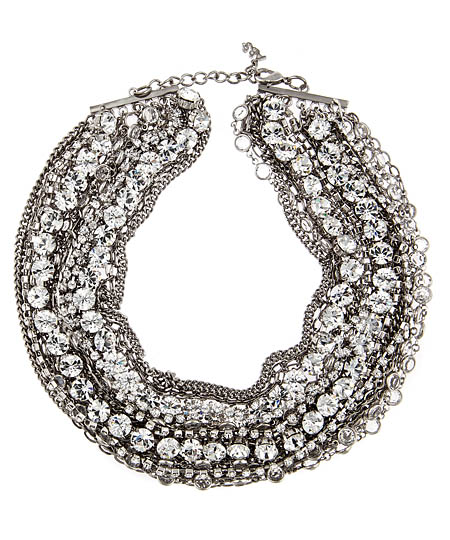 ABS multi-row torsade necklace boasts an explosion of crystals, chains, twists and turns. It's a devastatingly stylish piece not for the faint of heart. The last few seasons have been all about the statement necklace, and this piece is definitely one to have in your repertoire. Fabulous!