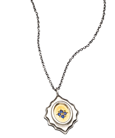 Take your look in a new direction with the sapphire east and west pendant from Adel Chefridi. The necklace makes great use of the mixed metals. The gold center of the silver pendant is accented by four sapphire stones in the center.