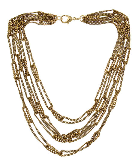 Wow a crowd with this delightful multi-chain necklace by Ali NY. The gold plated necklace is draped with a cluster of chains, each featuring its own tangled design. The chain clusters create a powerful look around your neck.