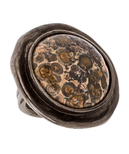 This wax carved round stone ring by Allison Daniel is a fashionista’s dream. The ring is implemented with graceful designs and timely appeal. A leopard-like pattern can be seen on the top of the gunmetal ring.