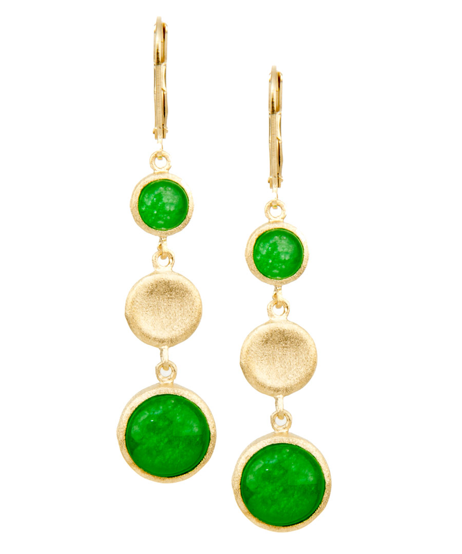 These green aventurine coin earrings by Andara are a sweet surprise. The 18k yellow gold plated earrings let three coin-style designs dangle in the wind. The outer coins are of green aventurine stones while the center coin is simply plated in gold.