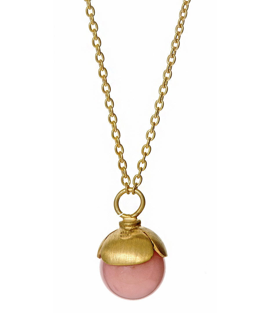 Arena CPH nada pink opal necklace will have you looking pretty in pink. A sensational pink opal sphere has 18k yellow gold plated petals covering its top where it attaches to a 20 inch 18k yellow gold plated chain. Feel the healing energies of pink opal as you sport this marvelous piece. Necklace fastens with a hook-and-eye clasp.