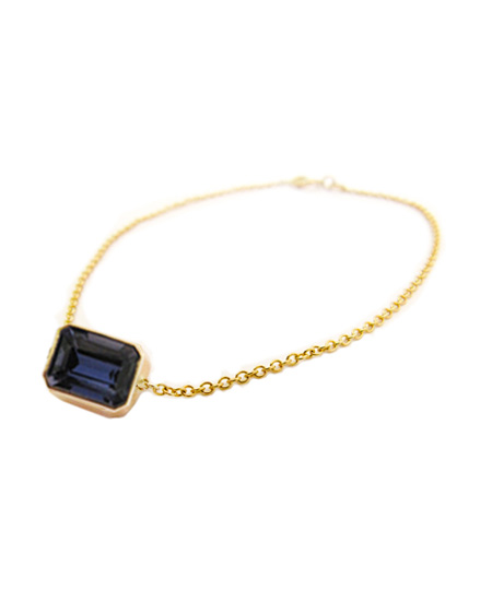 Floor your admirers (and your rivals) with Ariel Gordon's stunning stone ID bracelet. An emerald cut iolite gemstone is cupped in gold bezel and theatrically slung from a sleek 14K gold cable link chain. The jewel's strong hue and shape are bold details that beg to be flaunted.