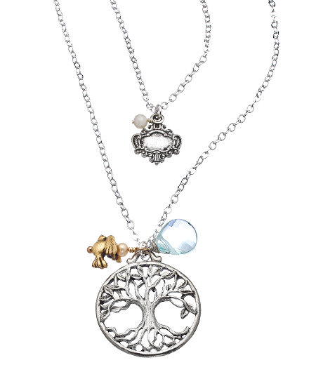 This double stranded necklace from Baubella by Sophia & Chloe makes wearing the layered trend easy. The added benefits are the cluster of charms on the longer necklace, including a 'tree of life' medallion, a golden dove, and a blue quartz. The shorter necklace has a royal shield and white pearl.