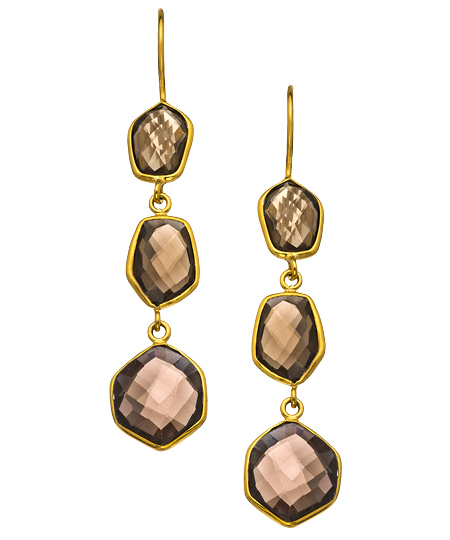 Dress up any outfit with this stunning pair of oval smoky quartz triple drop earrings from Belair. The glimmering smoky quartz gemstones dangle from gold vermeil french wires and reflect the light from all angles. They offers a warm, face-framing glow that will have people asking if you've just returned from a relaxing vacation.