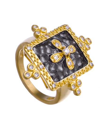This hammered shield ring from Belargo is dramatic and totally fabulous! Reminiscent of medieval times, the gold vermeil ring features a knight's shield with cubic zirconia accents. Be like the queen of Camelot with this amazing vintage-inspired statement-making accessory.