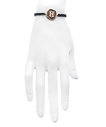 This charming rose gold and macrame reversible initial bracelet could only be from Blee Inara. Handsome grey macrame is joined in the center by a rounded, reversible initial charm. On one side is an uppercase initial, on the other, the same letter in lowercase type. Bracelet fastens with a sliding clasp. Please specify initial when ordering.