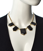 This Blu Bijoux gold with black hexagons bib necklace is a study in rich contrasting colors. The jet black hexagons are perfectly complemented by the richness of the gold bezels... completing the necklace is a strong, but feminine gold chain with a lobster clasp.
