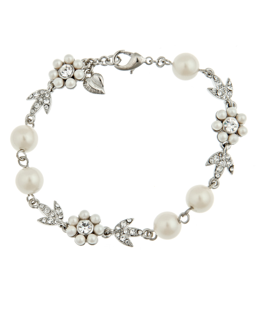 Strut in sophisticated style with this delicate Carolee floral pearl bracelet. Sparkling crystals with white pearls as petals form feminine flowers between unique three-leaf shapes and sets of two pristine pearls. Bracelet fastens with lobster closure.