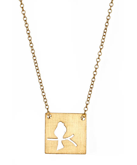 This bird on a branch pendant necklace in gold by Carrie Saxl is the perfect accessory for you or as a gift. A singular bird is perched on a cutout branch that rests in the center of the square pendant. The 14k gold filled chain slides through the holes at the top of the pendant with ease.