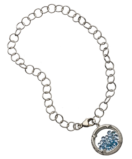 It'll be hard to not fall in love with the bubble chain mini shaker bracelet from Catherine Weitzman. The round transparent charm sparkles with light blue crystals in its center. This bracelet fastens with a lobster claw closure.