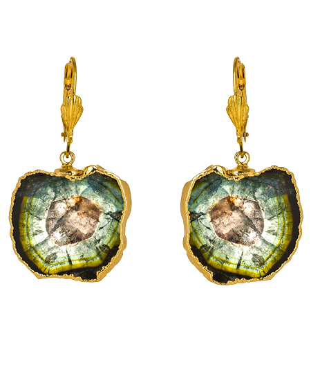 You'll make quite the impression when you're sporting these Jenny watermelon tourmaline drop earrings from Dara Ettinger. A watermelon tourmaline slice is rimmed in gold color for a style that's bold and beautiful. These earrings fasten with lever back closures for pierced ears.