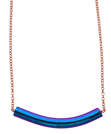 charge with this sleek statement-making dakota necklace from Devora Libin Jewels. The modern necklace features an eye-catching metallic glass bar pendant, that reflects an array of shiny colors. It brings your look a chic pop of color and is sure to turn heads.