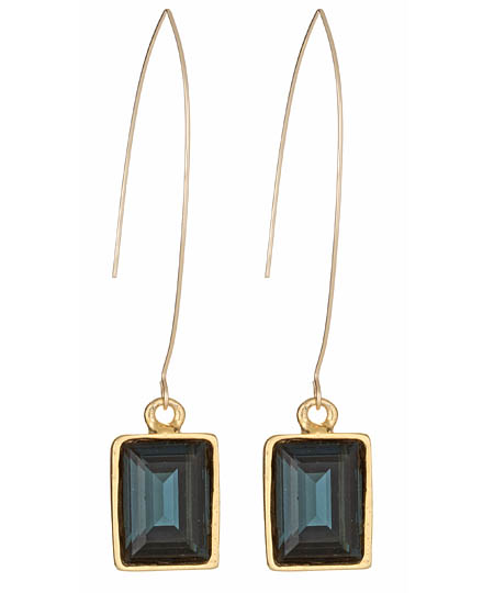 The Diana Warner angle drop earrings feature clean, modern lines for a striking design. Classic emerald-cut peacock blue Swarovski crystal drops add a delicate touch to this striking piece. The contemporary bent ear wires are designed for pierced ears. Length: Approximately 3 inches Metal: Gold plate Stone: Swarovski crystal