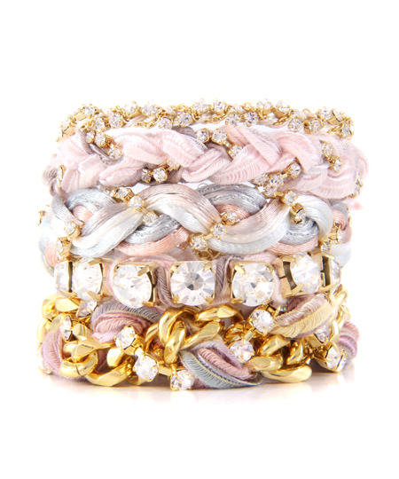 Ettika's 'S It Girl' stack bracelet set cascades up your arm with bold brilliance. This picture perfect set was inspired by Gossip Girl's Serena van der Woodsen and is crafted with silk and satin ribbons, 18 karat gold plated chains, rhinestones, and genuine Czech crystals. Wear all five together to evoke a creative dimensional feel.