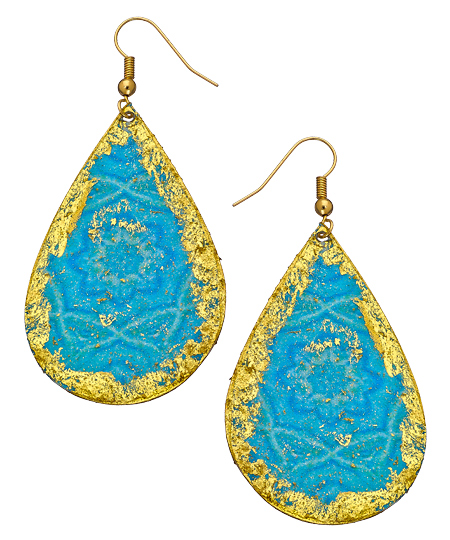 These Ibiza earrings from Evocateur are the perfect exclamation point for that perfect party outfit. Gold and turquoise will without doubt brighten things up. These earrings fasten with 14k gold plated French wire backs for pierced ears.