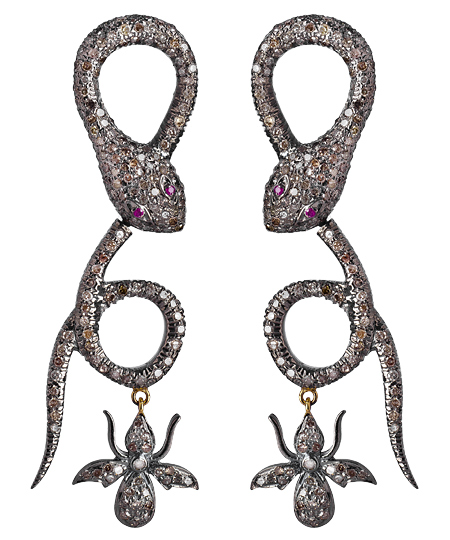 You'll get your fair share of beautiful brown diamonds in these diamond coiled snake and bee earrings from Hari Jewels. The bee charm is paved with diamonds and hangs from the snake. The earrings fasten with 14k gold post back closures for pierced ears.