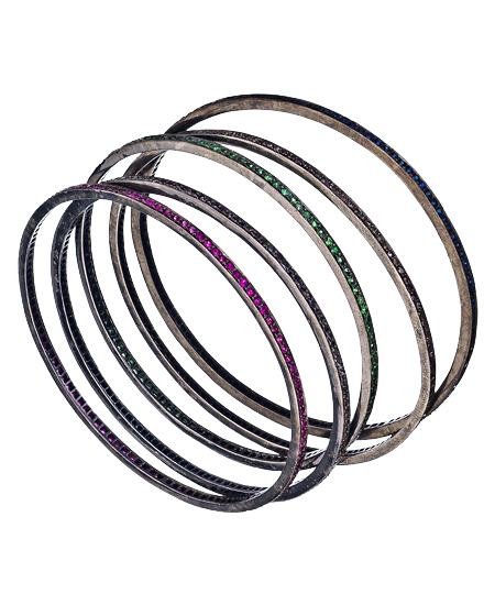 The silver jeweled bangles from Hari Jewels are truly magnificent. Each bangle is lined in an eternity design with gorgeous stones. Each bangle is sold separately. Get several and have fun mixing and matching the colors.