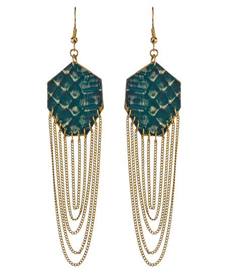 Try adding a somewhat edgy element to your look with these emerald gem earrings from Holy Harlot. The earring features cascading micro curb chains and is backed in gold gilt leather. These earrings fasten with a French wired back for pierced ears.