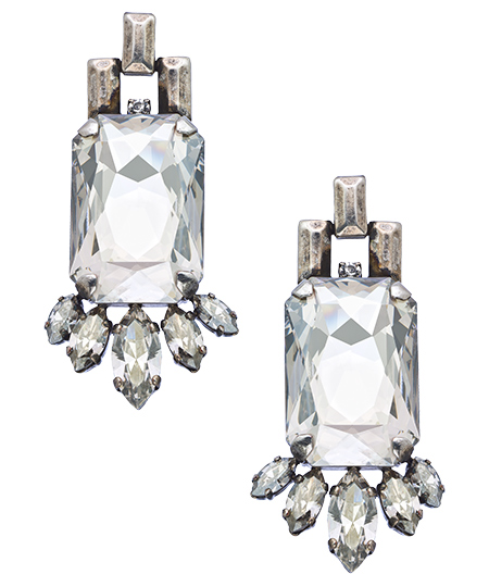 These Janis by Janis Savitt antique silver and crystal chandelier earrings are fit for a queen. Artisan crafted and rich-looking, the large, emerald shaped crystal is embellished with graduated, marquise shaped crystals at the bottom. Earrings have a post closure for pierced ears.