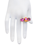 This Janis by Janis Savitt gold, fuchsia and astral pink crystal cocktail ring is almost like having your own personal light show or fireworks display. The gorgeous setting of oval and emerald cut stones is arranged to provide maximum drama. The color shifting of the stones - from pink to orange, is simply mesmerizing and the versatility of this lovely ring, with its flexible coiled band, is nothing short of astonishing.
