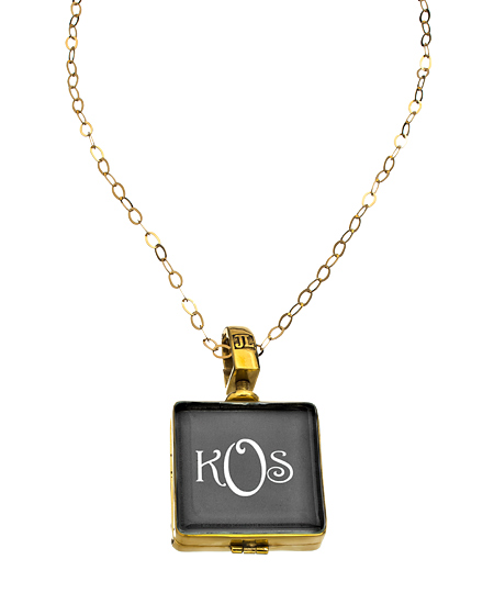 Display your favorite person's photo proudly on this grey, one-inch square, double-sided locket from Journey Lockets. Your photo on one side, and your three-letter monogram in white letters on a grey background on the other side, displays both to their best advantage. Initial of your last name appears in the center. The extra long vermeil chain is made up of small ovals and features a lobster claw closure and finishes with the brass locket.