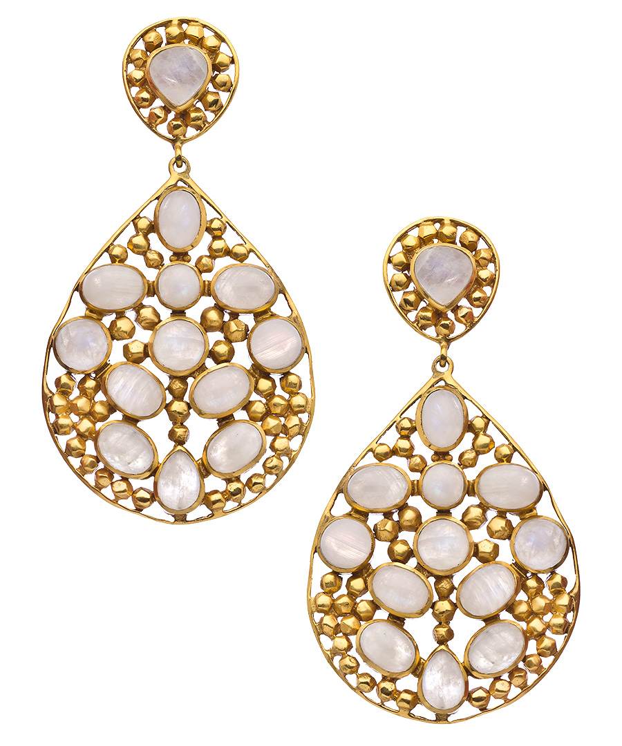 Perfect for that special evening out, these dazzling moonstone Mosaic earrings from Julie Vos offer head-turning appeal. Fashioned in 24-karat gold plated settings, each teardrop-shaped earring is set with a brilliant array of cabochon moonstones. They include straight back posts for pierced ears.