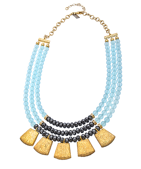 With K. Amato's gorgeous hematite seafoam triple row necklace, you've just found an easy way to give outfits a fun and feminine flair. A lovely mix of seafoam and faceted hematite beads, with bib made with gold trapezoid charms, makes a bold style statement.