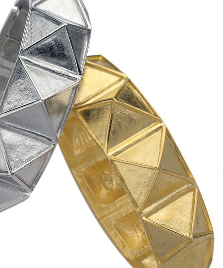 Kenneth Jay Lane Metal Pyramid Bracelets are punk chic. Layer or wear them alone. 3/4" in diameter with hinge closure. Brushed silver or gold.