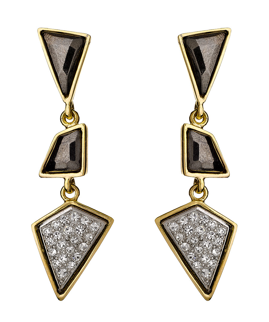 The road to great fashion is clearly laid out with these rocky road dangle earrings from Kenneth Jay Lane. Three unique shapes come together to form a fantastic pair of crystal paved dangle earrings. These earrings fasten with a post back closure for pierced ears.
