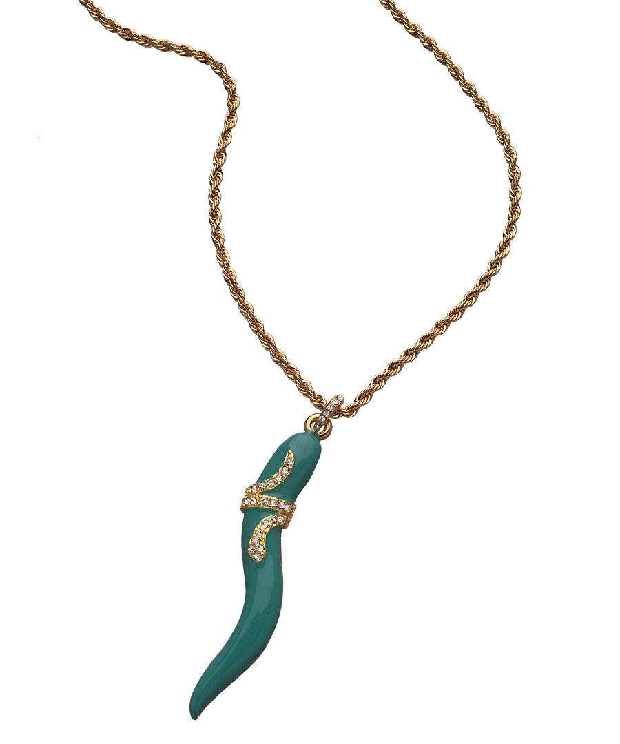 You'll make quite the impression in the turquoise snake charmer necklace from Kenneth Jay Lane. The eye catching pendant slithers with style and is covered in glimmering crystals. This necklace fastens with a hook and eye closure.