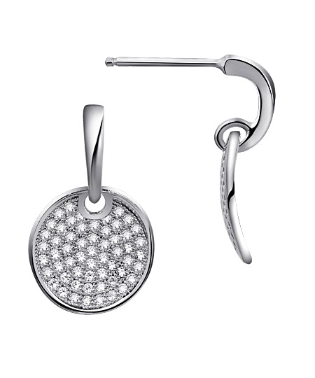 Add a flirty touch with the feminine Lafonn pave disk drop earrings. The shaped sterling silver disc is embellished with white gemstones and flutters at the bottom of the small hoop. The ear posts are designed for pierced ears.