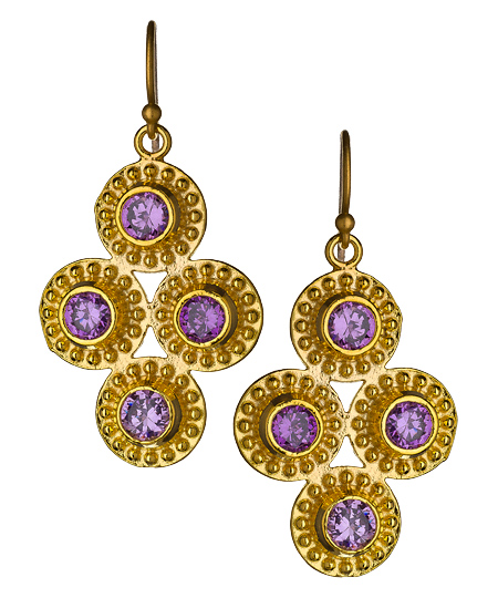 You'll look like royalty in these Indra purple 4 stone earrings from Marie Todd. Faux amethyst round cut cubic zirconia stones make the earrings even more enchanting. The earrings fasten with French wire backs for pierced ears.