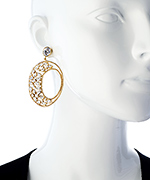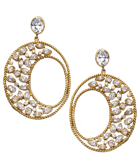 Meghna Designs' gorgeous gold and CZ Diva hoop earrings are the ultimate in exotic glamor. With twisted gold wire forming the outline, the field of generously scattered CZ stones delivers unmatched sparkle. These large earrings are versatile enough to accompany everything from casual, to business or party wear. Earrings have a post closure for pierced ears.