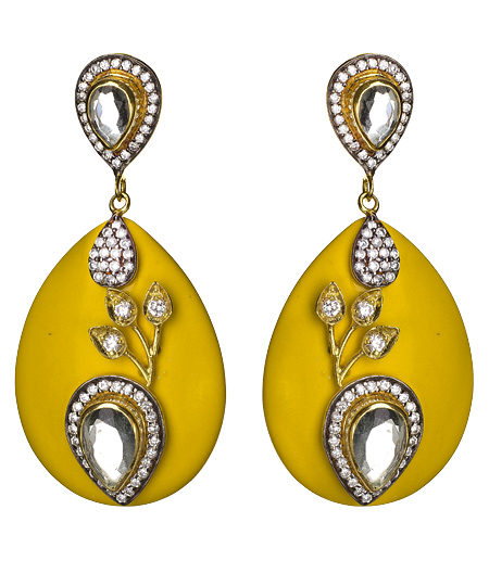 Bring some life and brightness to your ensemble with the addition of these yellow resin leaf earrings from Meghna Designs. The floral vibe is complimented by the dazzle of the cubic zirconias. These earrings fasten with post back closures for pierced ears.