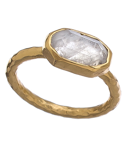 This opulent - but not ostentatious - Melinda Maria gold and moonstone Baby Slice ring is artisan crafted and classically elegant. Its rich, timeless look of luxury is created with a luminescent moonstone that is bezel set and placed on a band of textured gold. The interesting shape of the stone also contributes to the unique look.