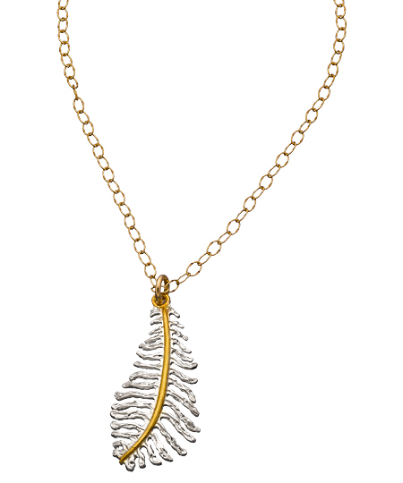 Make this medium two tone fern leaf necklace from MerriJane Morrison Jewelry a piece you wear on a regular basis. The two toned fern leaf pendant hangs from the gold filled cable chain. This necklace fastens with a lobster claw closure.
