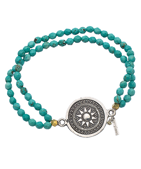 This Minu Jewels silver medallion and turquoise beaded bracelet is artisan crafted elegance in a bold, sleek design. Two strands of turquoise beads circle the wrist and provide a beautiful, colorful backdrop for the gorgeous silver medallion in the center. This bracelet was designed to make you smile every time you glance at it. Bracelet stretches for the perfect fit.
