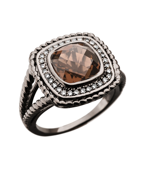 You'll look extraordinary in the diamond smoky quartz cushion twist cocktail ring from Mystic Light. The ring features two tones of silver. The band and outer edge at the top are oxidized sterling silver and the inner ring is sterling silver paved with diamonds.
