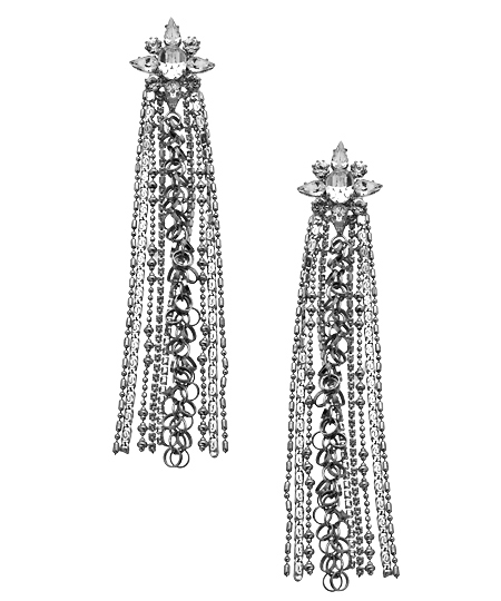 Ready… set… sparkle! - with these Otazu silver, Swarovski crystal and multi-chain earrings. Curtains of gleaming silver box chains, link chains and beaded chains are suspended from the glorious crystal designs, which support the post closure for pierced ears.