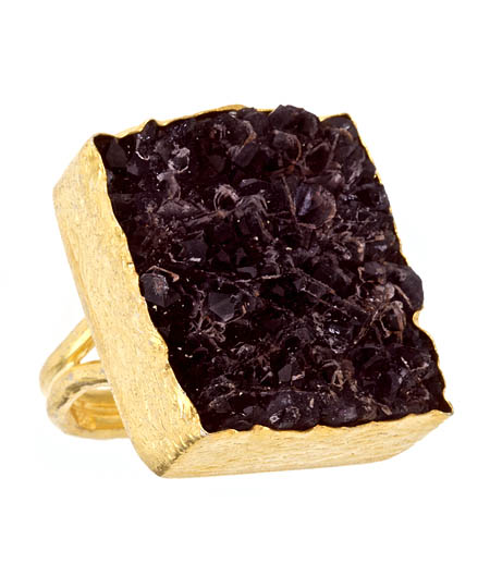 Show off your appeal with this amethyst druzi single ring by Primadina. The druzi stone is elegantly carved with various points and grooves. The amethyst color is wonderfully chic against the 18k gold vermeil of the ring. The ring is adjustable from sizes 6 to 10.
