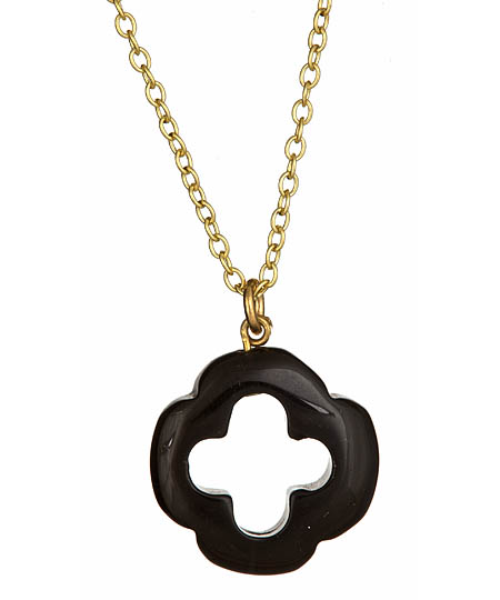 This Privileged clover necklace is a delicate piece, featuring a singular small pendant. The necklace is comprised of a thin gold chain, followed by a small black clover pendant.