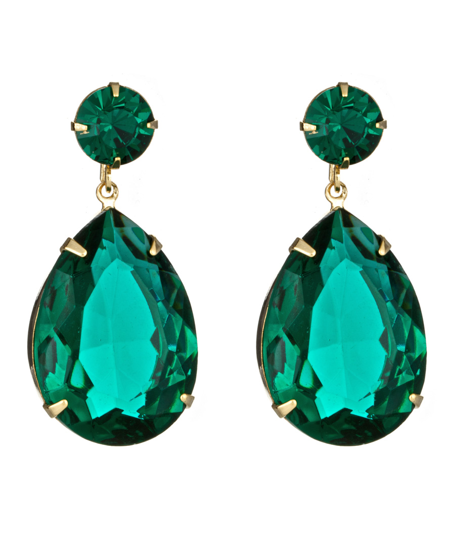 The Roberta Chiarella green crystal teardrop earrings are red-carpet ready. The large dangling crystal teardrop is simply stunning in a pronged setting. The ear posts are decorated with a round crystal detail and have post backs for pierced ears. Available in your choice of gold plated or platinum plated.