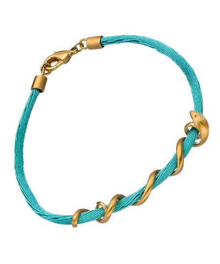 With its sleek and serpentine design, this turquoise 'Arm Yourself' bracelet from Satya Jewelry is just what you want to wear with a vampy dress for your daring style debut. The bracelet is pure silk with a gold snake coiled in the center. Sexy floor-length dress? Flirty tea-length? You'll be ready for life's close-ups.