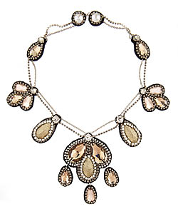 This Copenhagen necklace in champagne by Suzanna Dai is elaborately created. Crystals and teardrop-shaped rhinestones backed by black leather align the silver chain on this piece. Gold lame-covered beads and rows of rhinestones decorate this immaculate necklace.