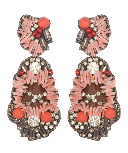 Make an entrance they'll never forget when you walk into the room wearing these memorable Suzanna Dai coral Malé drop earrings. The asymmetric fabric backing sports a goldtone chain trim that creates a border around clusters of coral chips, faceted orange beads, and rhinestones of various shapes and sizes. These one-of-a-kind earrings are designed with sterling silver post backs for pierced ears.
