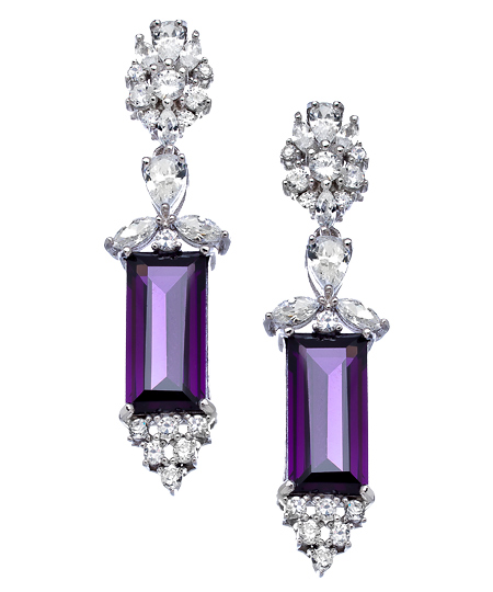 Day-to-evening style gleams with these bold and beautiful purple CZ rectangle drop earrings from Tang and Song. They feature amazing linear deep purple cubic zirconias dangling from brilliant clusters of clear stones. These gorgeous earrings are set in sterling silver and garner lots of attention.